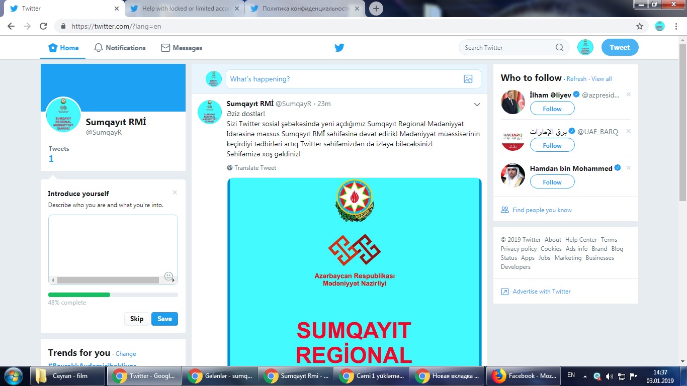 Mədəniyyət müəssisərinin keçirdiyi tədbirləri artıq Twitter səhifəmizdən də izləyə biləcəksiniz!